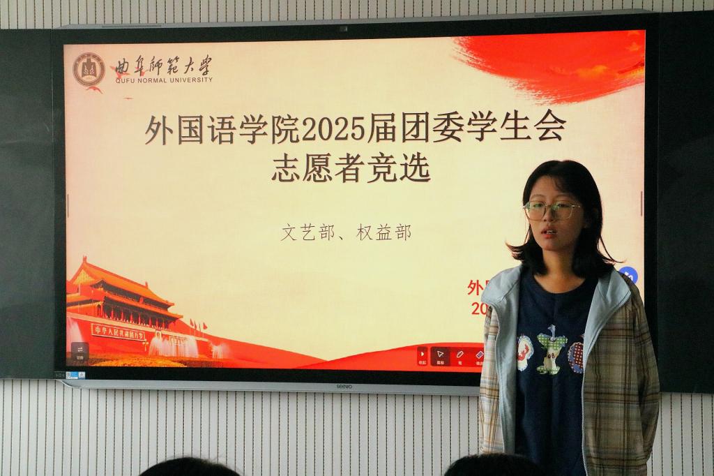 为充实学生会力量,保障学院工作顺利开展,外国语学院于9月27日完成2025届团委学生会纳新工作。本次纳新工作由主席团及各部门部长负责,2025级新生积极参与竞选。