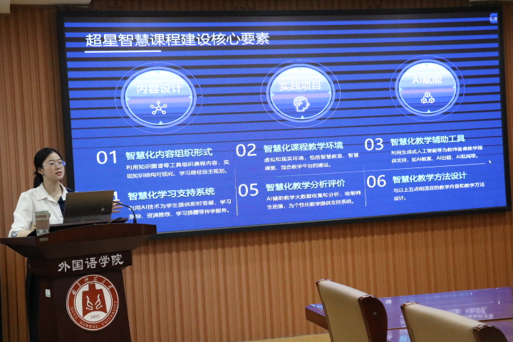 为积极响应教育数字化转型号召,探索人工智能在教育领域的深度应用,5月21日下午,外国语学院于系楼206会议室举办了“AI赋能智慧课程建设与教学模式创新”实践探索活动。本次活动由邢加新副院长主持,邀请超星集团付忠英老师为学院教师介绍其AI教学平台,助力提升教师教学创新能力。