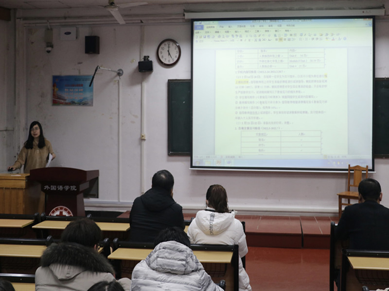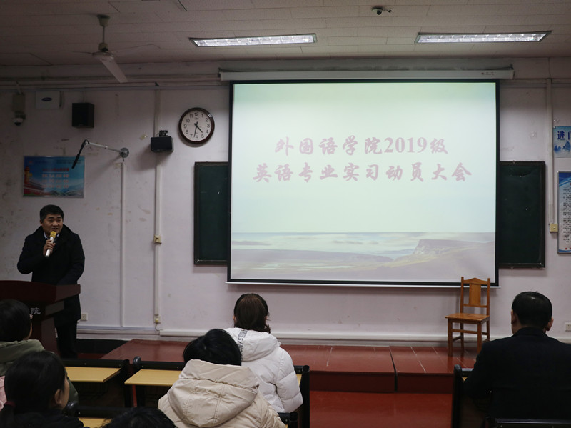 1月5日下午,外国语学院于系楼201室召开2019级英语专业实习动员大会。此次会议由我院2019级辅导员张晓主持,党委副书记王作茂、副院长邢加新、英语系主任徐欣以及各支教实习指导老师出席大会,2019级英语专业全体学生参加。