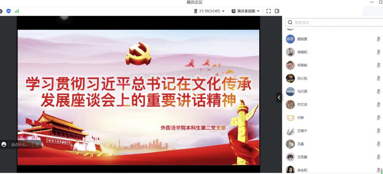 为深入学习贯彻习近平总书记在文化传承发展座谈会上重要讲话精神,推进学习贯彻习近平新时代中国特色社会主义思想主题教育走实走深,外国语学院本科生第二党支部于7月1日召开学习贯彻习近平总书记在文化传承发展座谈会上重要讲话精神线上理论学习会。