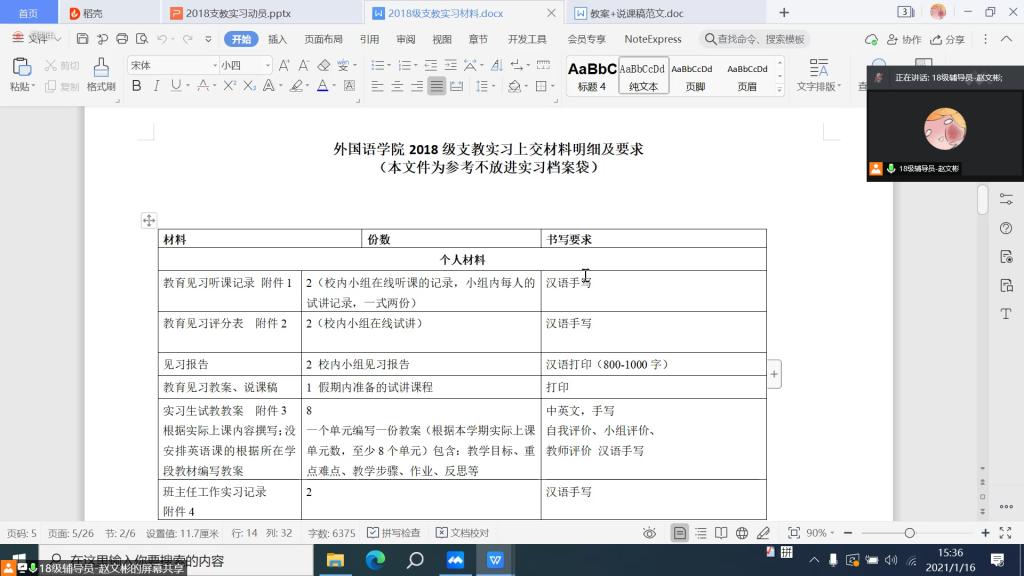 会议伊始,高歌老师阐述了实习支教的重要意义,并希望同学们能够珍惜支教机会,潜心教学,认真备课,不断提高自身教学业务水平,为将来的教师之路奠定坚实的基础。随后,高歌老师详细介绍了2018级支教实习计划安排、实习资料、实习过程中指导教师的工作内容以及山东省师范生从业技能大赛内容,并就实习支教期间可能遇到的问题作了梳理。同时,教育学生要学会沟通交流,正确处理个人与实习单位领导老师、学生家长和学生之间的关系。正值疫情期间,大家要切实增强安全防范意识,确保人身和财产安全。