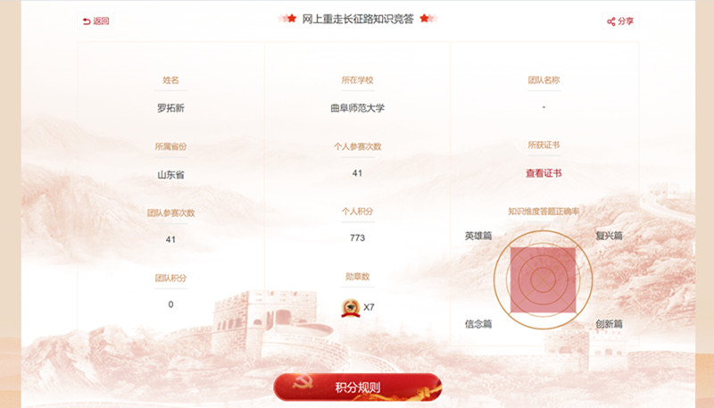 本次“网上重走长征路”知识竞答活动共分为英雄篇、创新篇、复兴篇、信念篇、限时赛、抢十赛六部分。活动设置相关题目,同学们回答问题获得的积分即可兑换证书。本次活动对发展传承历史文化的形式进行了创造性转化和创新型发展,新颖灵活的知识竞答形式激发了同学们学习历史的热情,增强了同学们对我国历史文化的认同感、归属感。题目中包含的真实影像资料,有利于帮助同学们深入理解长征的历史意义,培养爱国主义精神。本次活动得到了同学们的积极响应,希望外院学子能够再接再厉,继续积极参与。