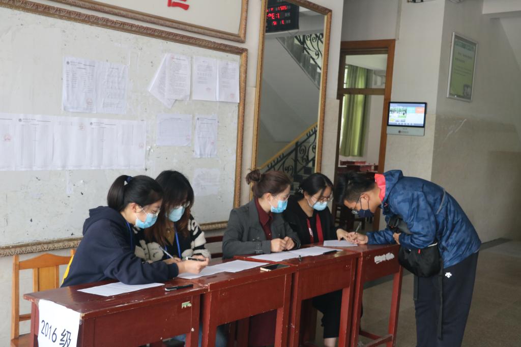学生代表在学院门口帮助考生们进行体温测量。进门后,两侧分别为15级、16级考生的登记处,bet365