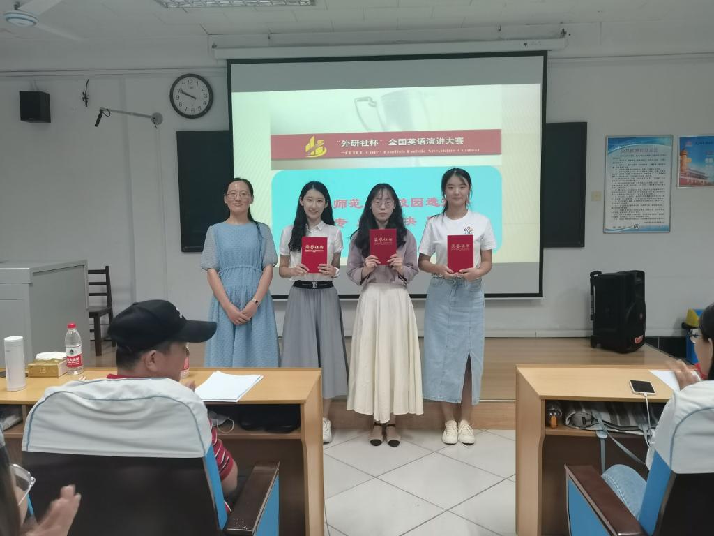 本次比赛在初赛定题演讲和回答问题两个环节的基础上增加了即兴演讲和图片描述环节。第一轮得分排名在前九位的选手进入第二、三轮比赛。伴随着赛场紧张的氛围,比赛拉开帷幕。经赛前充分的准备后,各位参赛选手以饱满的精神状态迎接了这场比赛。在第一轮演讲的过程中,参赛选手们声情并茂,淡定自如,带来了一场场精彩的演讲,赢得了在场评委和观众的热烈掌声。选手们面对评委老师所提出的问题,冷静思考,沉着应答,顺利完成第一轮比赛。第二、三轮比赛,考验的是选手们临场发挥的能力和自身的英语功底。各位参赛选手及时调整状态,在比赛时有条不紊,机智应对,展现出了高水平的语言表达能力和灵活的应变能力。最终,翟欣然、徐天悦和金瑞三位同学荣获一等奖。吉锡媛老师对选手们的表现给予肯定,并建议选手们演讲时要注意语速语调,增强演讲吸引力。