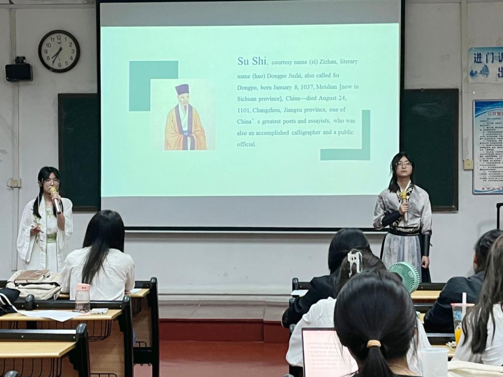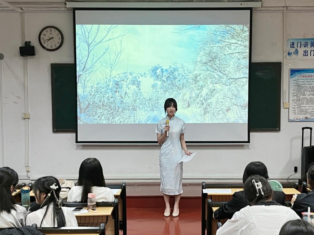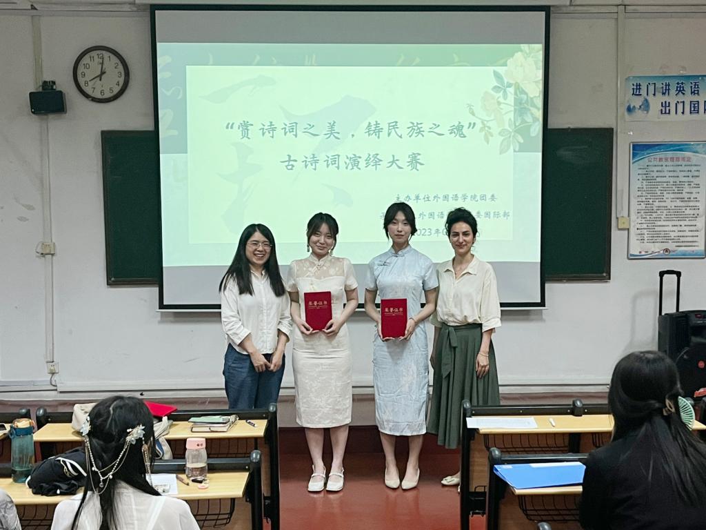 本次比赛分为用外语演绎古诗词和解读古诗词两个环节。选手们衣着得体,仪态大方,颇具翩翩风度,令人眼前一亮。演绎环节中,选手们将贴合诗词的PPT、优美的背景音乐与感情真挚的朗诵相结合,为大家带来一场视听盛宴,赢得了热烈的掌声。解读环节中,选手们深入剖析了诗歌的精神内涵,以简洁流畅的话语,架构起贯通古今的理解体系,给予观众强烈震撼。经过激烈角逐,岳灵儿、赵乐冉获一等奖,耿鑫漪等获二等奖,王伟钦等获三等奖。参赛选手表示,备赛增长知识,比赛提升自信,未来将继续学习古诗词,为弘扬中华优秀传统文化贡献力量!