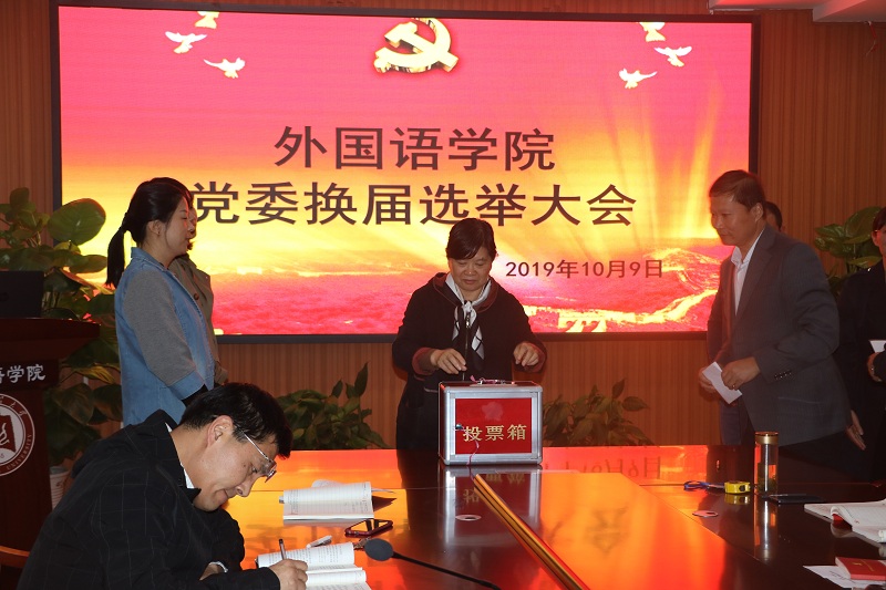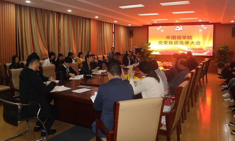 党委在206会议室召开学院全体师生党员大会进行外国语党委换届选举工作。换届选举大会由学院党委副书记王作茂主持。