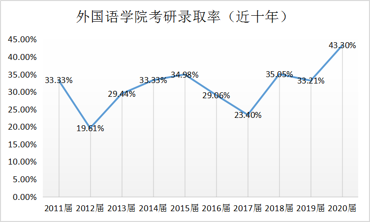 2020届毕业生共有254人(其中:英语、俄语、法语总计194人,英语公费师范生60人),报考187人(其中:英语、俄语、法语总计171人,英语公费师范生16人),除公费师范生外,报考率达88.14%,过国家A线比例达到54.6%,共有95名同学顺利考取了硕士研究生(其中:英语、俄语、法语考取84名、英语公费师范生考取11名),除公费师范生外,考研升学率达43.3%,其中10名同学被国外高校录取。考研成功人数、升学率均创近十多年来新高。