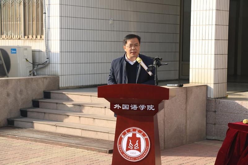伴随着庄严的国歌声,活动正式开始。学校党委常委、副校长胡钦晓代表学校致辞,他对学院“语众不同,丽溢曲园”教育主题给予肯定,作出重点培养人文素养、拓宽学术视野、促进跨文化对话的指导,并对同学们提出了“爱国、爱校、爱专业”的期许。随后,学校党委常委、副校长胡钦晓和党委常委、组织部部长郭庆兵共同为本次主题教育活动揭幕。