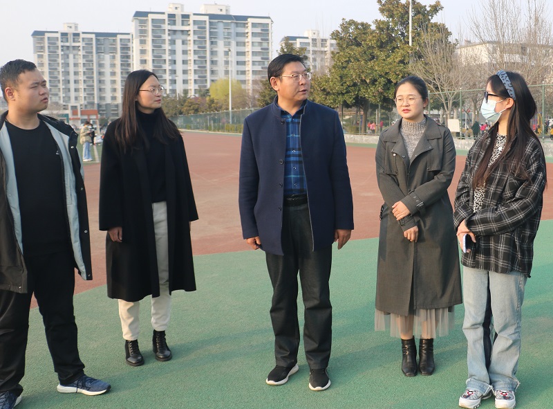 党委副书记王作茂、学院团委老师张晓、辅导员王伟、赵文彬及2021届学生会主席团成员前往西操场看望春训的学子们。