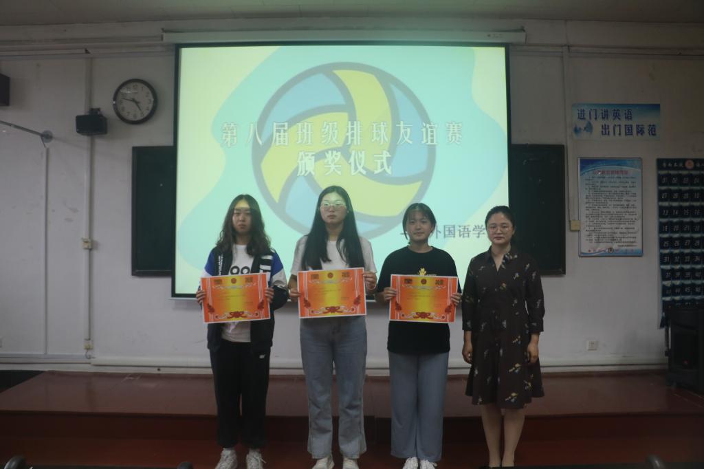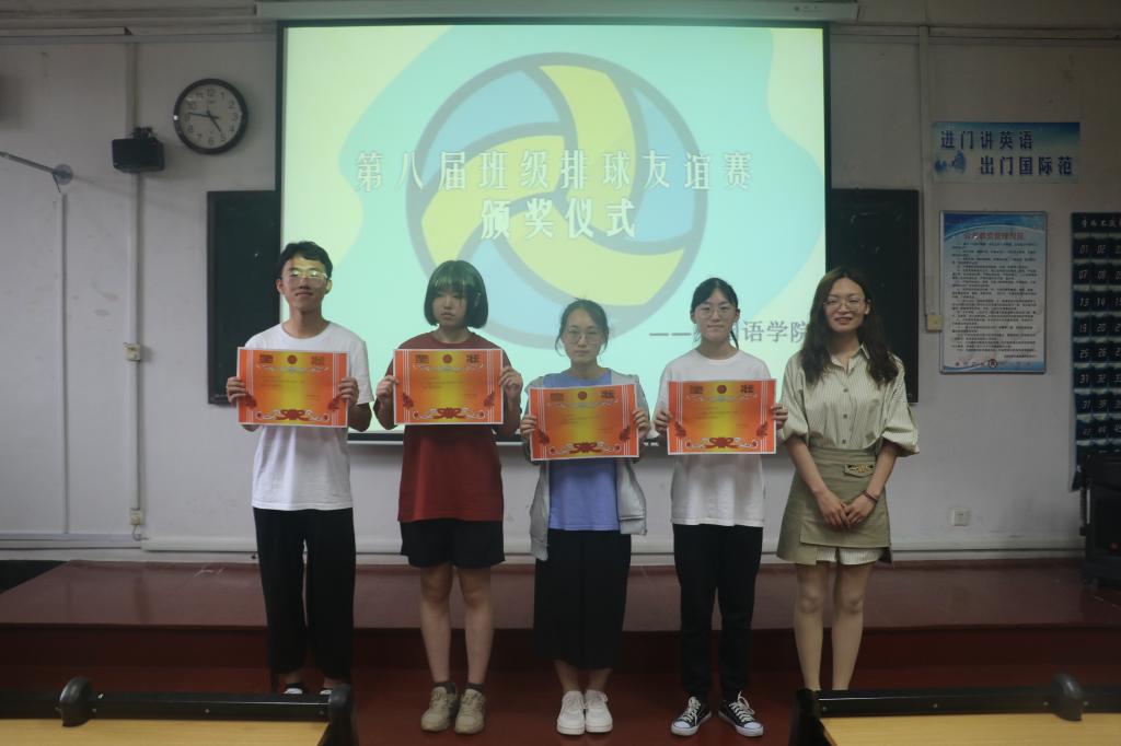 上午八点,比赛开始。班级士气高涨,场上气氛活跃。其中,20级俄语班以独特的加油口号给人留下深刻的印象,英语一班场上组织有序,冷静应战。争夺冠亚军的比赛十分激烈,场上精彩纷呈,观众呐喊声不断。最终,决赛以19级英语三班取得冠军、20级英语二班取得亚军,20级俄语班战胜英语一班,两个班级分别取得第三、第四名的结果圆满结束。
