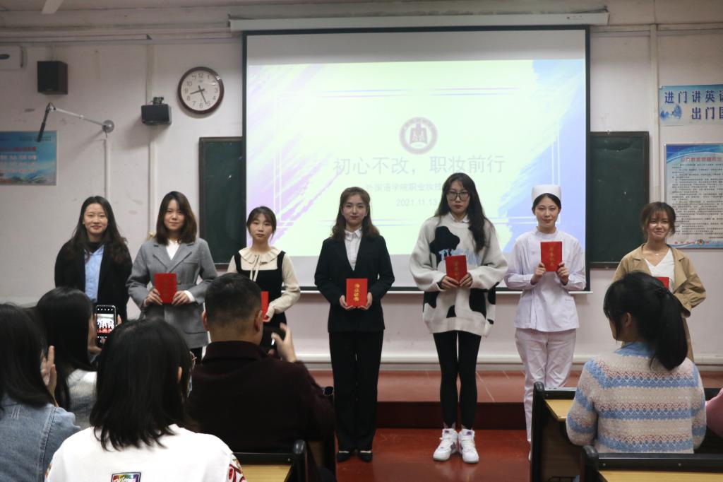 本次比赛包括模特展示和模拟面试两个环节。在本次比赛中,选手们各展风采,向同学们呈现了多样化的职业类型,展现了外院学子自信、积极、开放的形象。其中,2019级张梦帆组的模特自信大方,她向我们呈现了带货主播所具备的场控能力与产品介绍能力,赢得了评委们的一致夸赞。20级英语三班的高曦组模特身穿黑色简约女士西服,以流利地道的口语,得体大方而又不失活力地向我们展现了作为一名外企翻译优雅知性,积极自信的职场女性形象。在选手们各自展现后,评委们根据每位选手的化妆技能、语言表达、逻辑思维和举止仪表等进行现场评分,得分较高者列入获奖名单。最后主持人宣读获奖名单,评委们分别为获奖同学颁奖,比赛在现场观众的热烈掌声中落下帷幕。