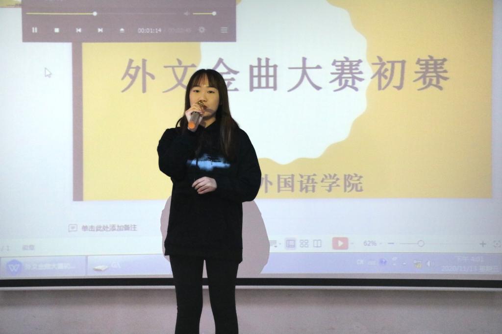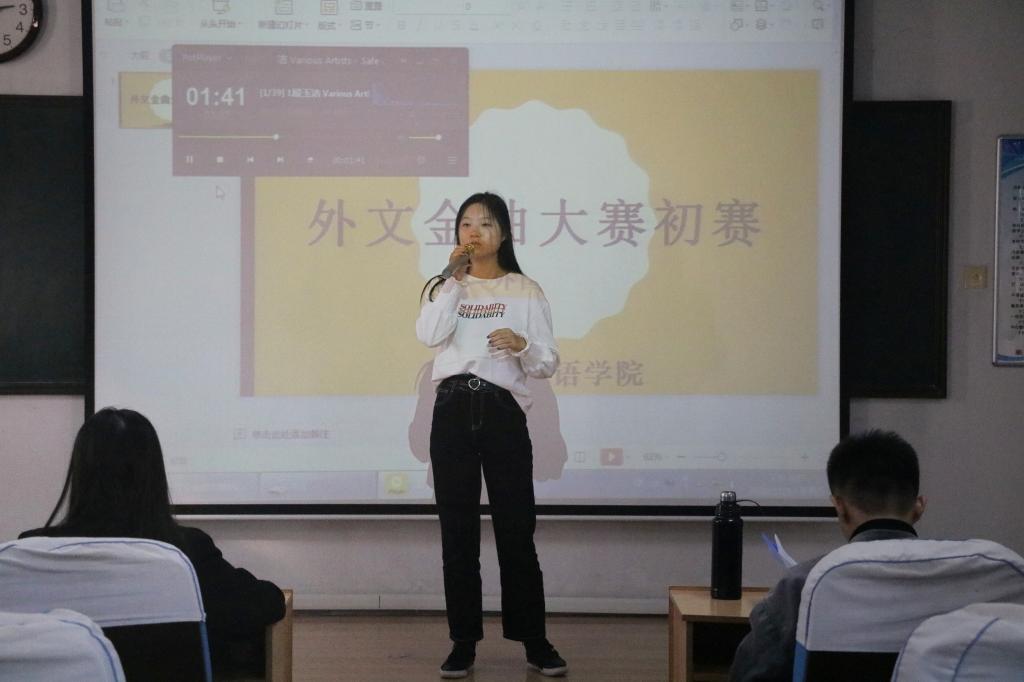 本次比赛以“外语飞扬,乐动曲园”为主题,面向全体外院学子,采用个人、组合两种表现形式,自选英文歌自由演唱。比赛在热烈的掌声中拉开帷幕,选手们发音标准,歌声悦耳,表现精彩,给在场的评委和观众们带来了一场绝佳的听觉盛宴。其中,2021级英语五班曹文畅同学演唱的《Like I Do》节奏鲜明欢快,转音婉转自然,让人印象深刻。2020级英语师范三班的丁彦心声音深沉浑厚,演唱的City of Stars》,如讲故事般娓娓道来。2020级英语三班魏艺鸣、2020级英语四班任智涵演唱功底深厚,声音极富感染力。最后,在激烈的角逐中,曹文畅、丁彦心、魏艺鸣、张瑞萱等十位同学凭借出色的表现成功晋级决赛。