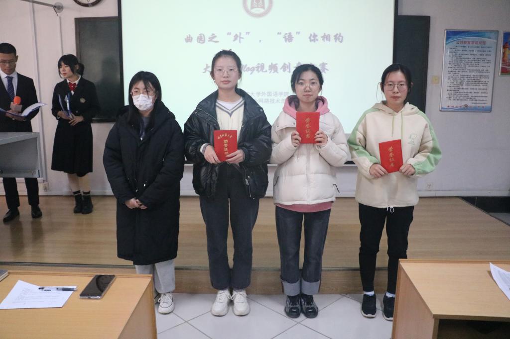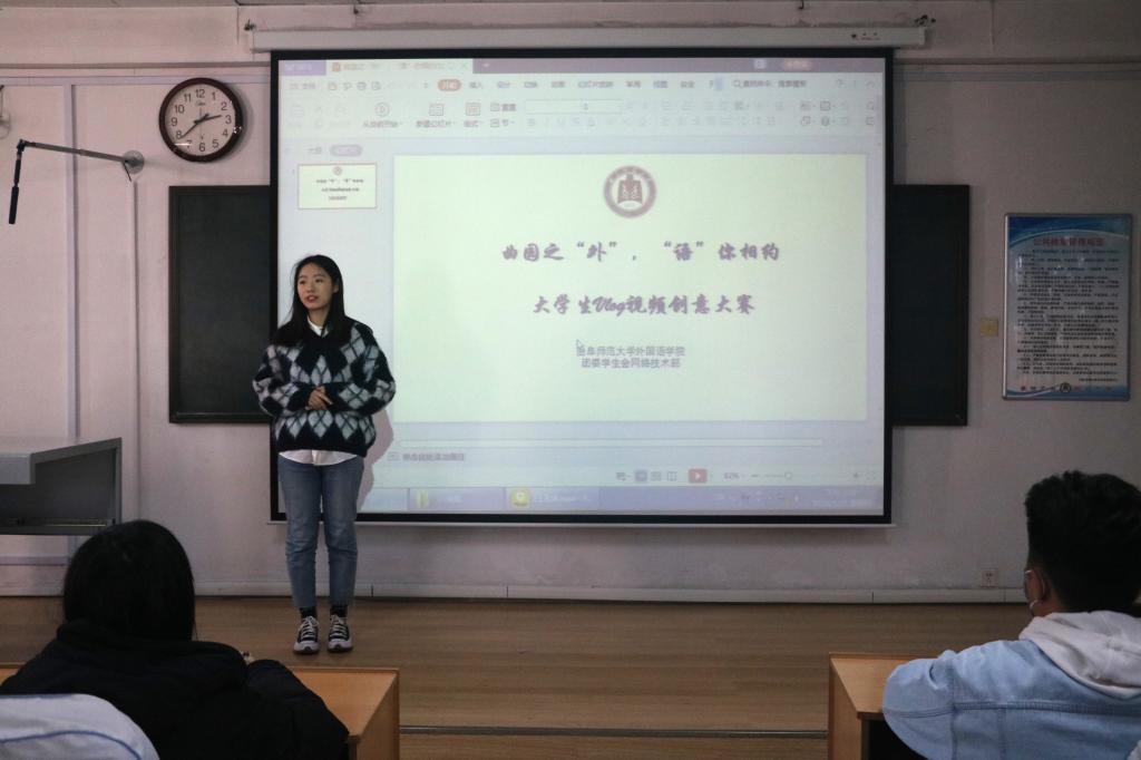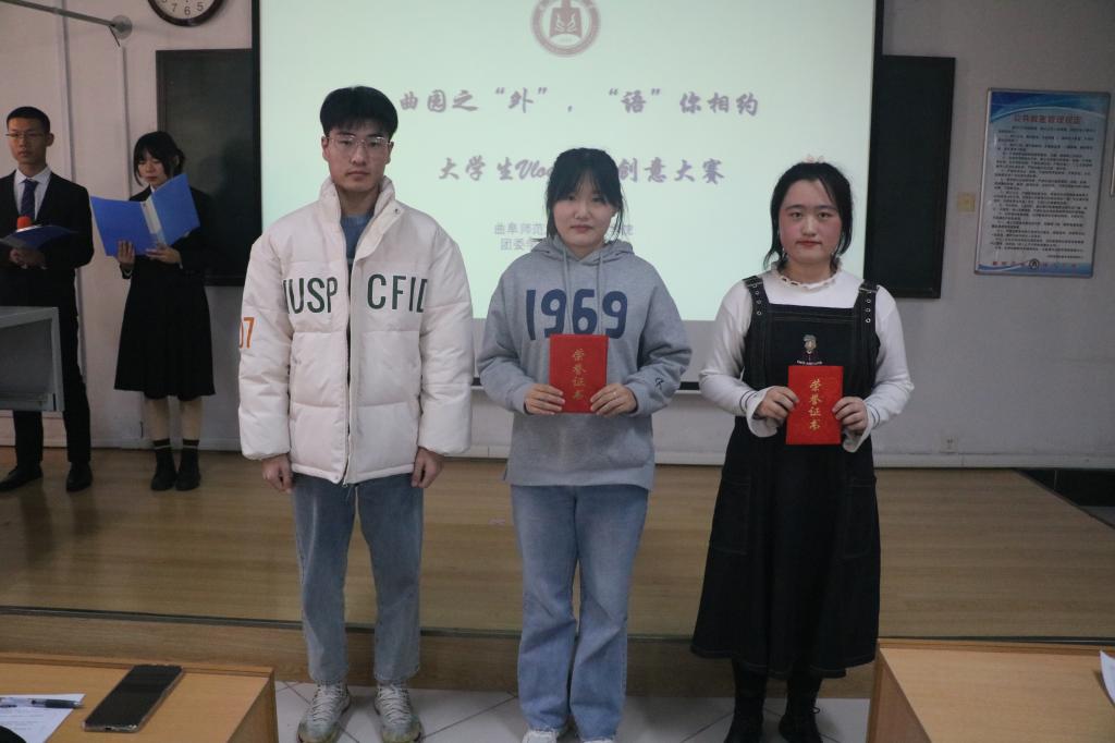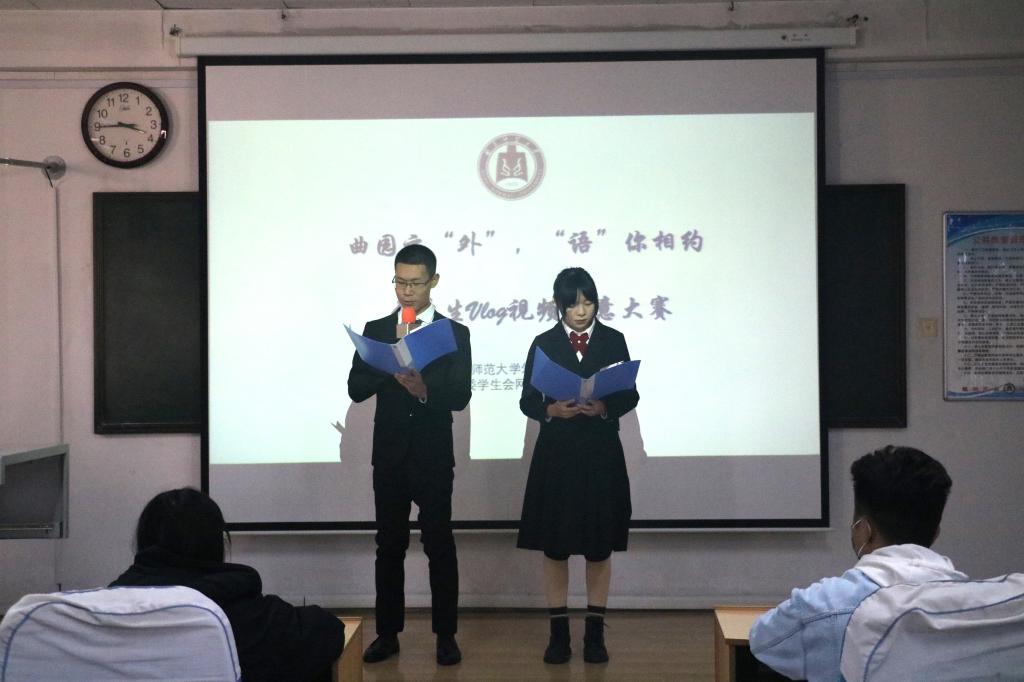 于系楼301室举办“曲园之‘外’,‘语’你相约”vlog创意大赛。本次比赛由李一凡、孙佳蕊主持,辅导员张晓、王伟,学生会副主席王德龙担任比赛评委。