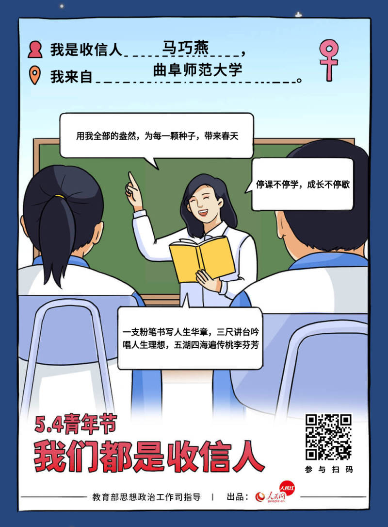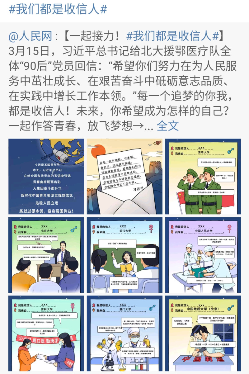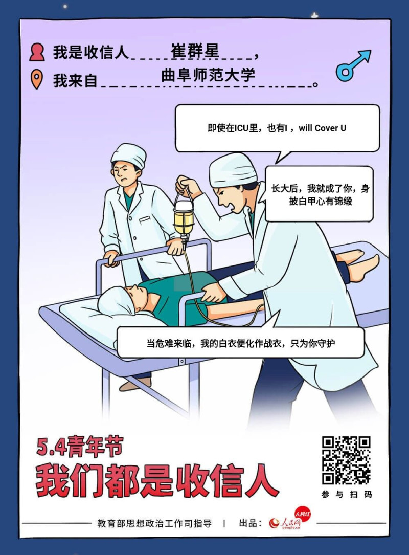 习近平总书记在给北京大学援鄂医疗队全体‘90后’党员回信中表示:“希望你们努力在为人民服务中茁壮成长、在艰苦奋斗中砥砺意志品质、在实践中增长工作本领。”在新冠肺炎疫情防控斗争中,广大青年人不畏艰险、冲锋在前、舍生忘死,彰显了青春的蓬勃力量,并用行动证明新时代的中国青年是好样的,是堪当大任的!外院学子们认真领会收信精神,积极争当收信人,在此活动中一起作答青春,放飞梦想。他们或以“用一支粉笔书写人生华章,三尺讲台吟唱人生理想,五湖四海遍传桃李芬芳”作为青春答案;或以“显微镜下洞悉生命秘密,试管里穷究自然密令,孜孜以求,攀登人类智慧的高峰”作为青春答案;或以“扎根一方沃土,成就最美的芳华”作为青春答案,成功诠释了每一位追梦的你我都是收信人。