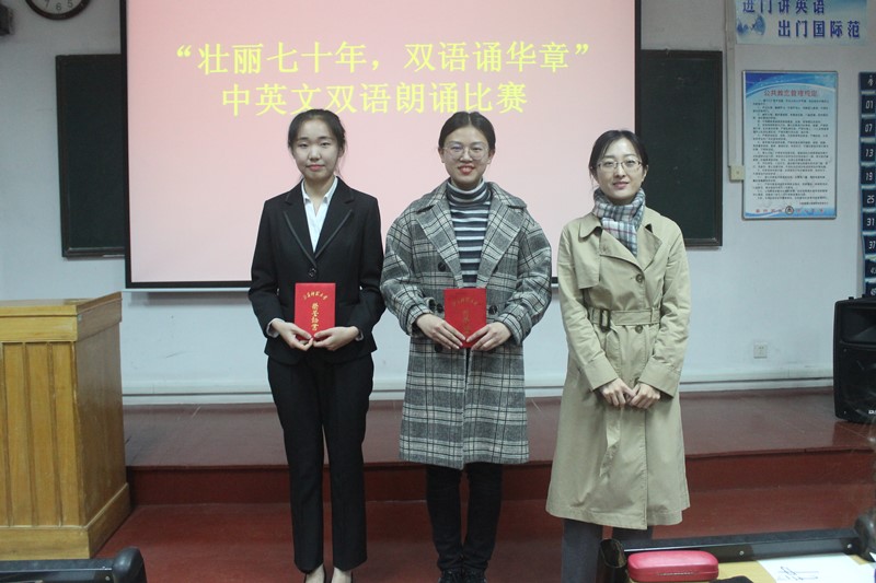 此次比赛分为两个组别:专业组和非专业组,一共有十组选手参赛。他们用汉语和英语致敬祖国七十周年来的不懈奋斗,致敬祖国七十周年来的发展创造,致敬祖国七十周年来的飞跃突破,展现了对祖国的无限支持与热爱。比赛开始,非专业组通过充满感情的朗诵带领大家回忆了祖国七十年来的风风雨雨,充分体现了她们对祖国无限的敬畏和崇拜,对祖国背后无数科学家无私奉献精神的歌颂。在十分钟的中场休息后,专业组比赛开始,第一组徐莹组以一身充满时代感的军装和与中国名人对话的创新形式将观众深深带入情境,她们讲述了中国七十年来的巨大变化,并且呼吁所有人守护这个可爱而伟大的中国。第二组李硕组以古筝开场,将他们深深的感情融入到清脆曲调中,巧妙地融合了中外文化,拨动了观众的心弦。在各组的精彩表现后,主持人宣布徐莹组荣获专业组一等奖,王晓琛组荣获非专业组一等奖。随后,满虎老师对本次比赛作出点评,并为每位选手的自信、团队合作能力和爱国情怀点赞。至此,本次朗诵比赛圆满结束。