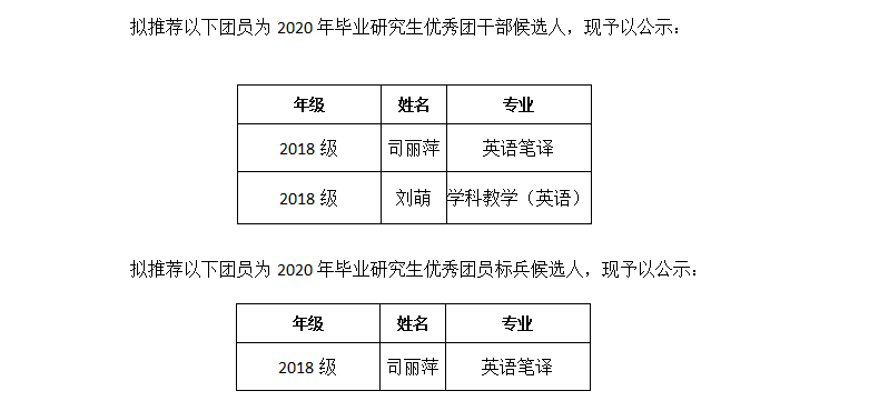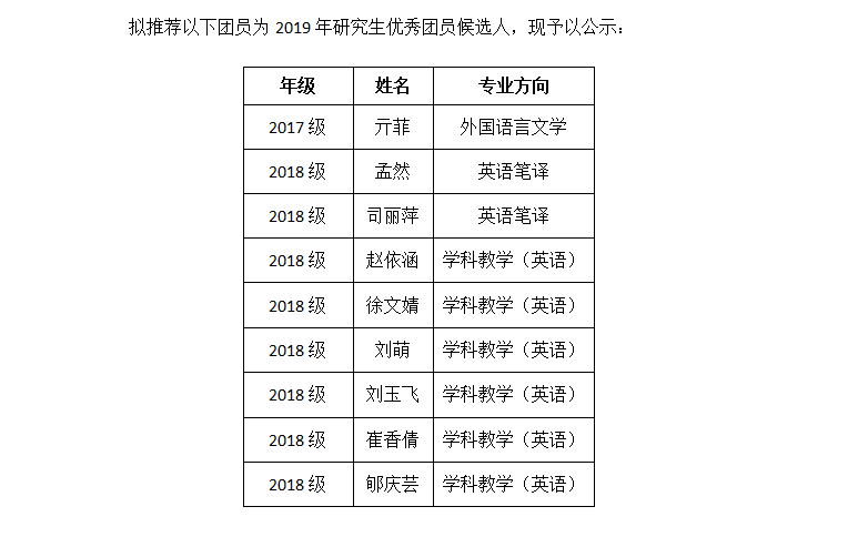2017级学术型研究生团员总数为14人,优秀团员1人。2018级毕业研究生团员总数为75人,优秀团员8人。其中学科教学(英语)54人(优秀团员6人),英语笔译21人(优秀团员2人)。2017级和2018级团员总数共计89人,优秀团员共计9人。