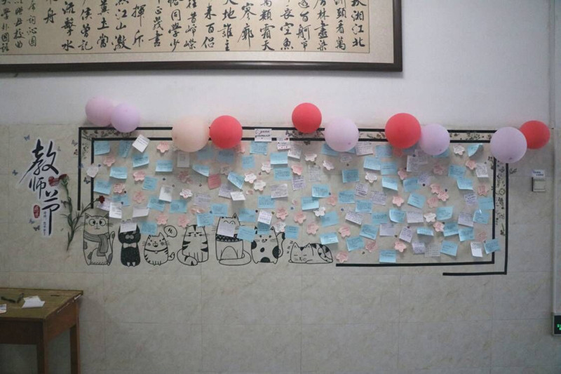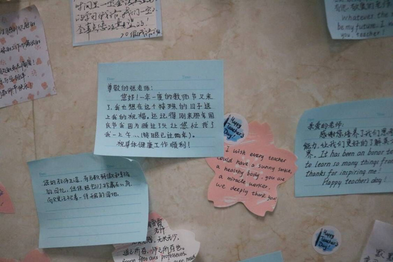 学子将自己对老师的真情实感写在便利贴上,并贴于西大厅展览墙。一张张精美的便利贴承载着同学们对老师无限的感激之情,增进了师生间的交流,营造了温馨的节日氛围。