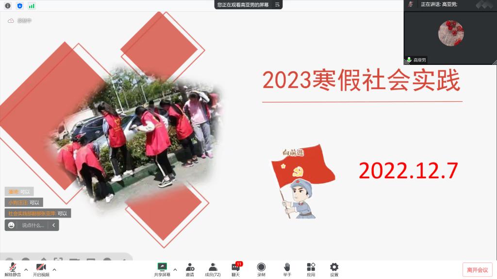 本次动员大会分为活动介绍、注意事项、经验分享、交流答疑四个环节,主要采取PPT展示和线上答疑的方式向同学们介绍寒假社会实践的详情。会议伊始,社会实践部副部长于璐首先明确了本次实践活动的主题为“学习宣传贯彻党的二十大精神”、“青鸟计划”、“黄河流域生态保护和高质量发展”等七个主题,紧接着对每个主题都进行了细致详细的讲解。随后,动员大会强调了实践过程中的注意事项,如投稿要求、安全至上原则、疫情防控等,从而提醒同学们在更好地参与实践活动的同时要做好自身防护。最后,社会实践优秀学生代表高亚男进行了社会实践经验的分享。高亚男通过精美的PPT,就前期规划、实践过程、宣传工作和实践报告等做了全面的讲解,鼓励同学们积极参加社会实践活动,切身体验实践所带来的收获和成长。