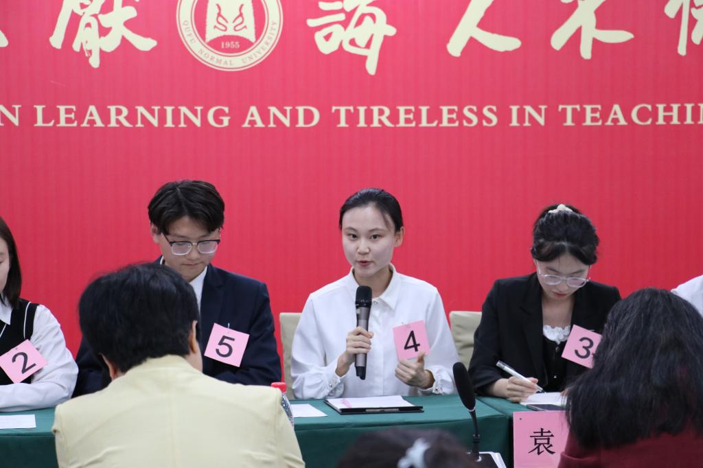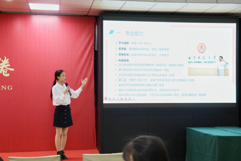 参加决赛。决赛共包括无领导小组面试、个人展示、答辩三个环节。在无领导小组面试环节,沙渺同学与其他选手经过良好的沟通交流达成统一意见,由所在小组发言人清晰准确地总结小组人员的选择;在个人展示环节,沙渺同学的简历展现出了深厚的专业基础,以流利的口语精准介绍简历,使沙渺同学得到评委老师好评;在答辩环节中,沙渺同学沉着冷静,以全英文应答评委老师的问题,对答如流,为此次答辩增光添彩。最终,沙渺同学在众多选手中脱颖而出,获得一等奖。