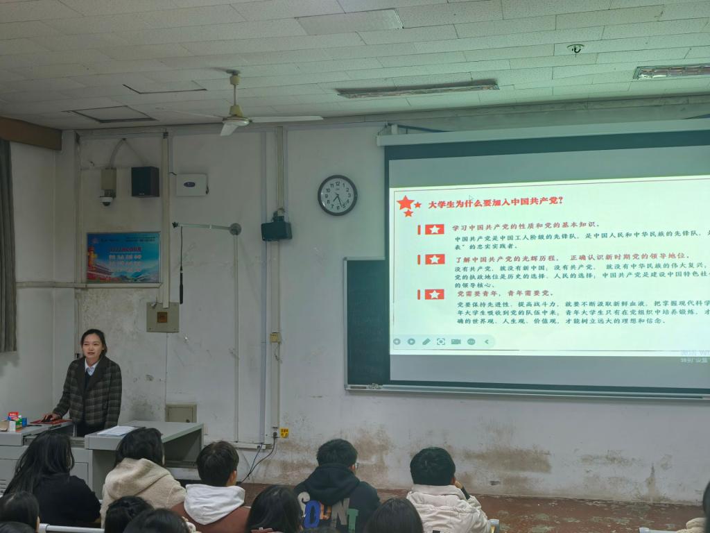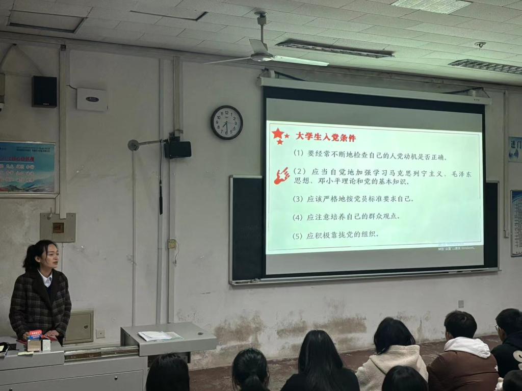 党委的基本情况,让同学们对学院党组织有了初步的认识。其次,她从党的光辉历史到党的性质、宗旨和使命方面深入普及了党的基本知识。随后,她强调了入党的严肃性和规范性,让同学们明白入党不仅是一种荣誉,更是一份责任和担当。最后,她鼓励各位新生积极进取,以实际行动向党组织靠拢,预祝同学们早日成为一名优秀的中国共产党员,为实现中华民族伟大复兴的中国梦而努力奋斗。