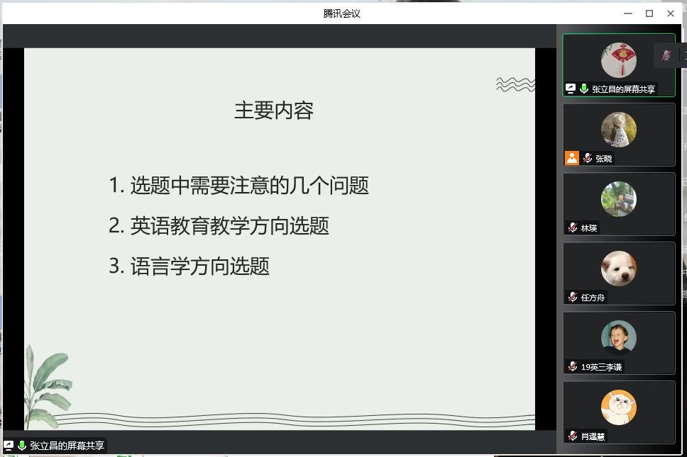 随后,张立昌老师就英语教育教学与语言学、林瑛老师就文学、王海霞老师就翻译方向进行具体选题指导。本次会议为保证2019级学生精准选题提供了机会,希望通过本次会议,2019级全体同学能够为毕业论文撰写工作争取一个良好开端。
