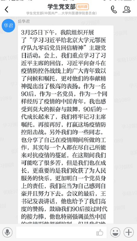 学生党支部组织群分享本次主题党日活动的经验感悟。