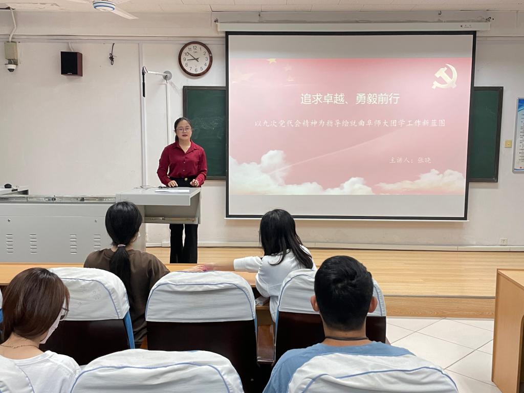 学院团委副书记张晓根据学校第九次党代会报告,详细阐述了大会主题、新发展阶段的历史使命和奋斗目标、奋力开启新征程的主要任务以及一流党建引领学校事业高质量发展等。她强调,全体团学骨干要将学校第九次党代会精神与学院实际相结合,勇做担当民族复兴大任的时代新人。