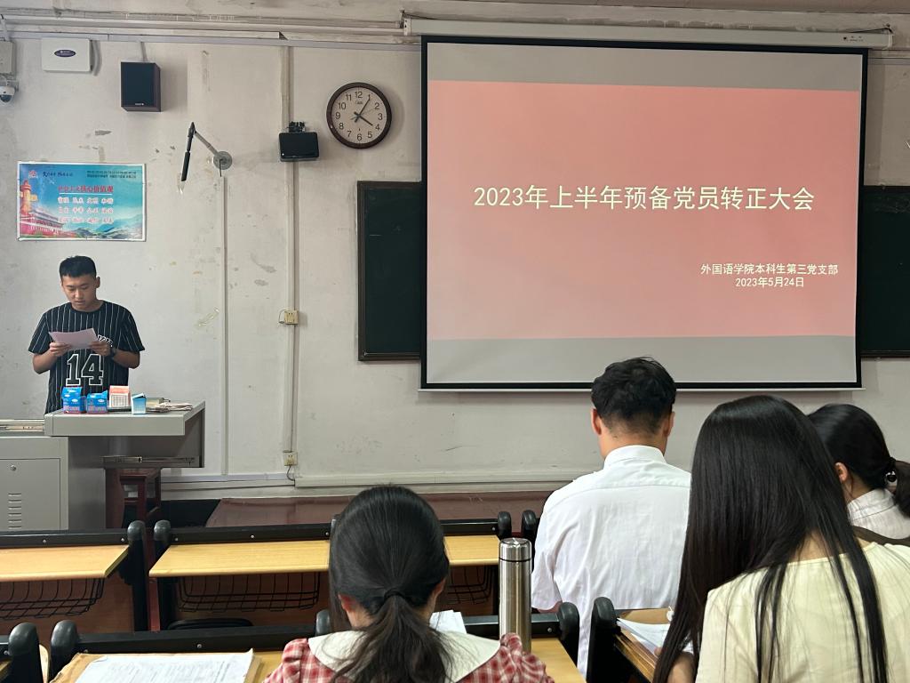 本科生第三党支部在系楼201召开2023上半年预备党员转正大会。会议由外国语学本科生第三党支部支部委员赵文彬主持,支部全体党员参加。