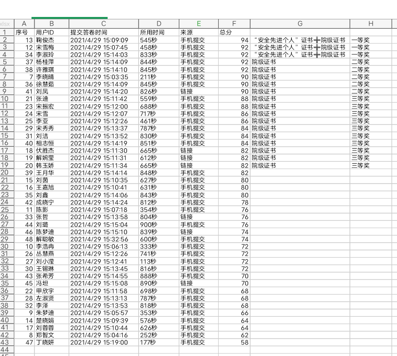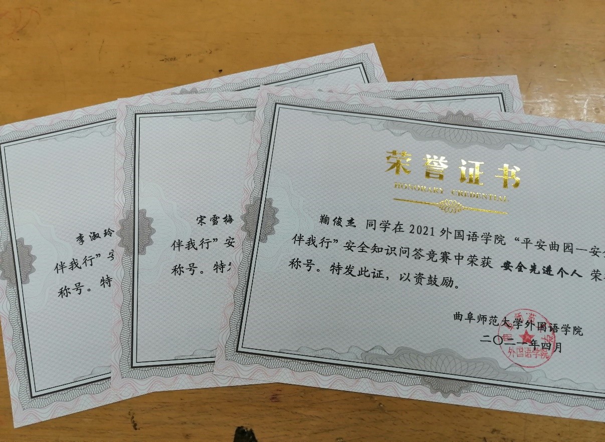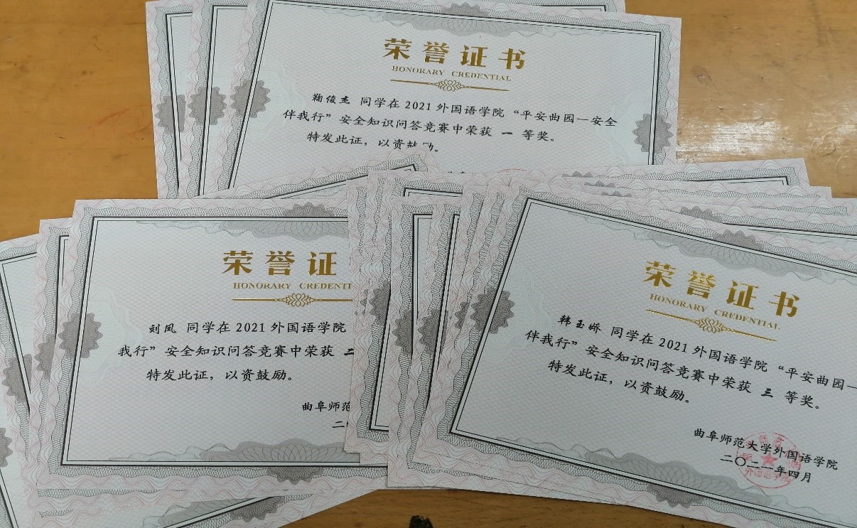 此次竞赛通过问卷星线上答题的方式进行,题目主要围绕消防安全、宿舍安全、用水、用电安全等方面。共有42名同学报名参加此次竞赛,均取得了优异的成绩。赛后,评选出了一等奖3人,二等奖5人,三等奖10人,还评选出了3名“安全先进个人”,并为获奖同学颁发了获奖证书。