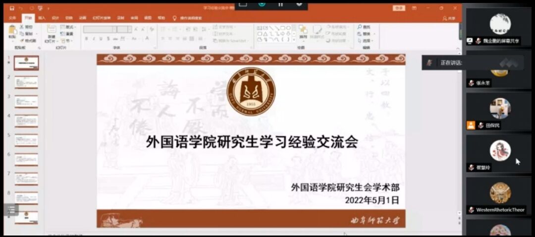 然后,七位经验介绍人分别传授了宝贵的个人经验,她们用精彩的PPT呈现了一部部奋斗史、一个个优秀事迹。孙娜娜同学向大家介绍了研究生时间管理的问题,明确学习目标、创造学习氛围能够帮助大家提高学习的专注度;朱晓婷同学结合自己的论文写作经验,分享了适合硕士研究生投稿的刊物类型;段明月同学提出参加师范生教学技能大赛是“以赛促学”的好方式,并详细介绍了参赛的流程和内容以及注意事项;隋玉双同学强调了关于课程学习的重要问题,提出课前做好预习、课上积极参与、课后完善笔记是一名研究生必备的学习素养和技能;王慧慧同学基于过往的论文写作与发表流程,分享了自己的投稿心路历程;成晓宁同学主要讲述了翻译硕士的专业实践,强调了理论转化为实践的重要性;刘国卿同学分享了研究生生涯的目标管理,鼓励大家化整为零、循序渐进。
