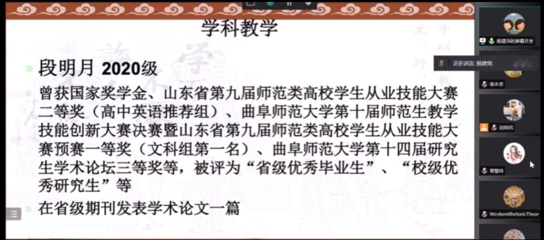 首先,主持人向大家介绍了本次经验交流会的主要流程。此次交流会邀请到了外国语言文学方向的孙娜娜和朱晓婷,学科教学方向的段明月、隋玉双和王慧慧同学,翻译方向的成晓宁和刘国卿七位成绩优秀、学术能力突出的研究生作为主讲嘉宾。